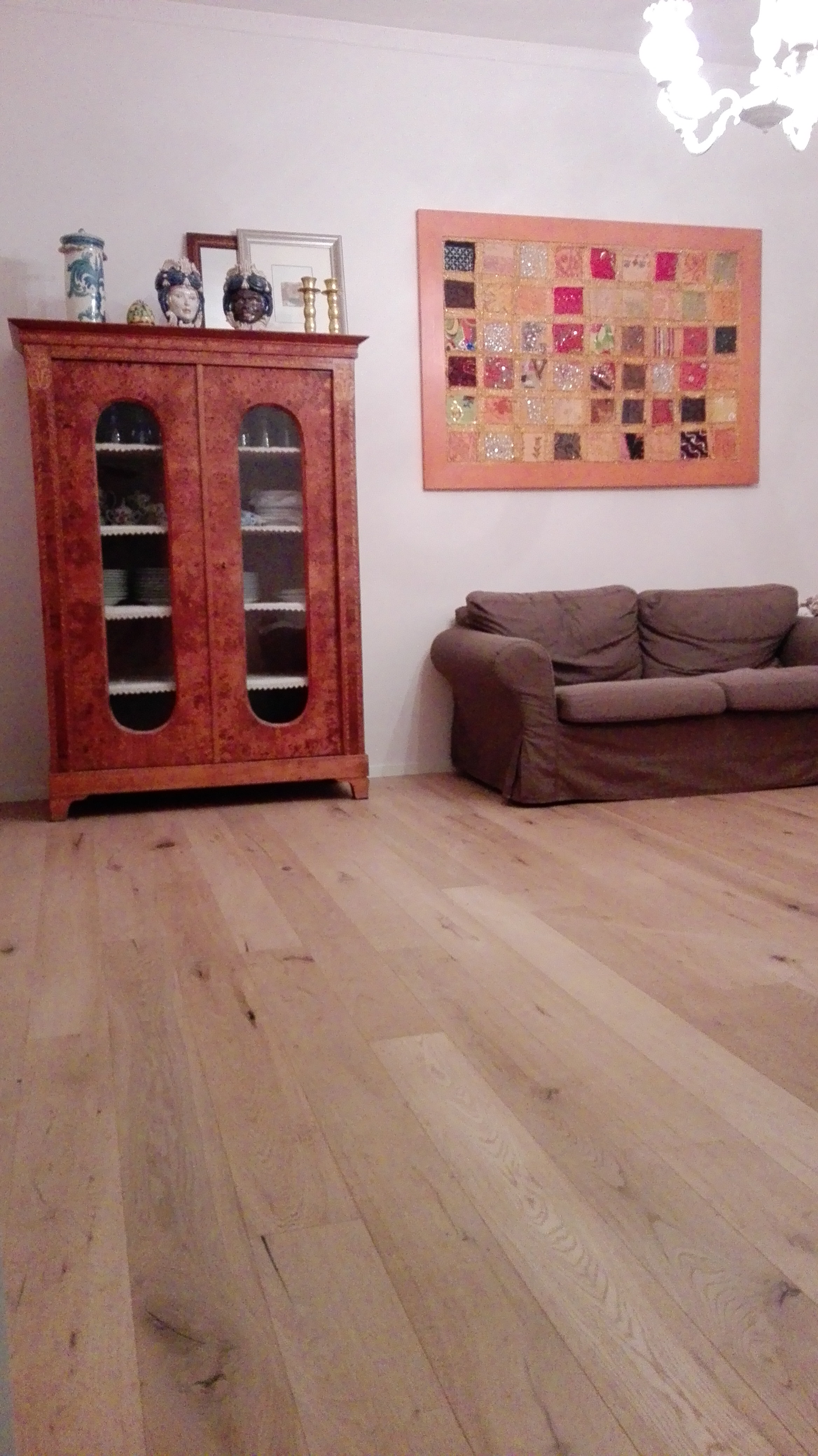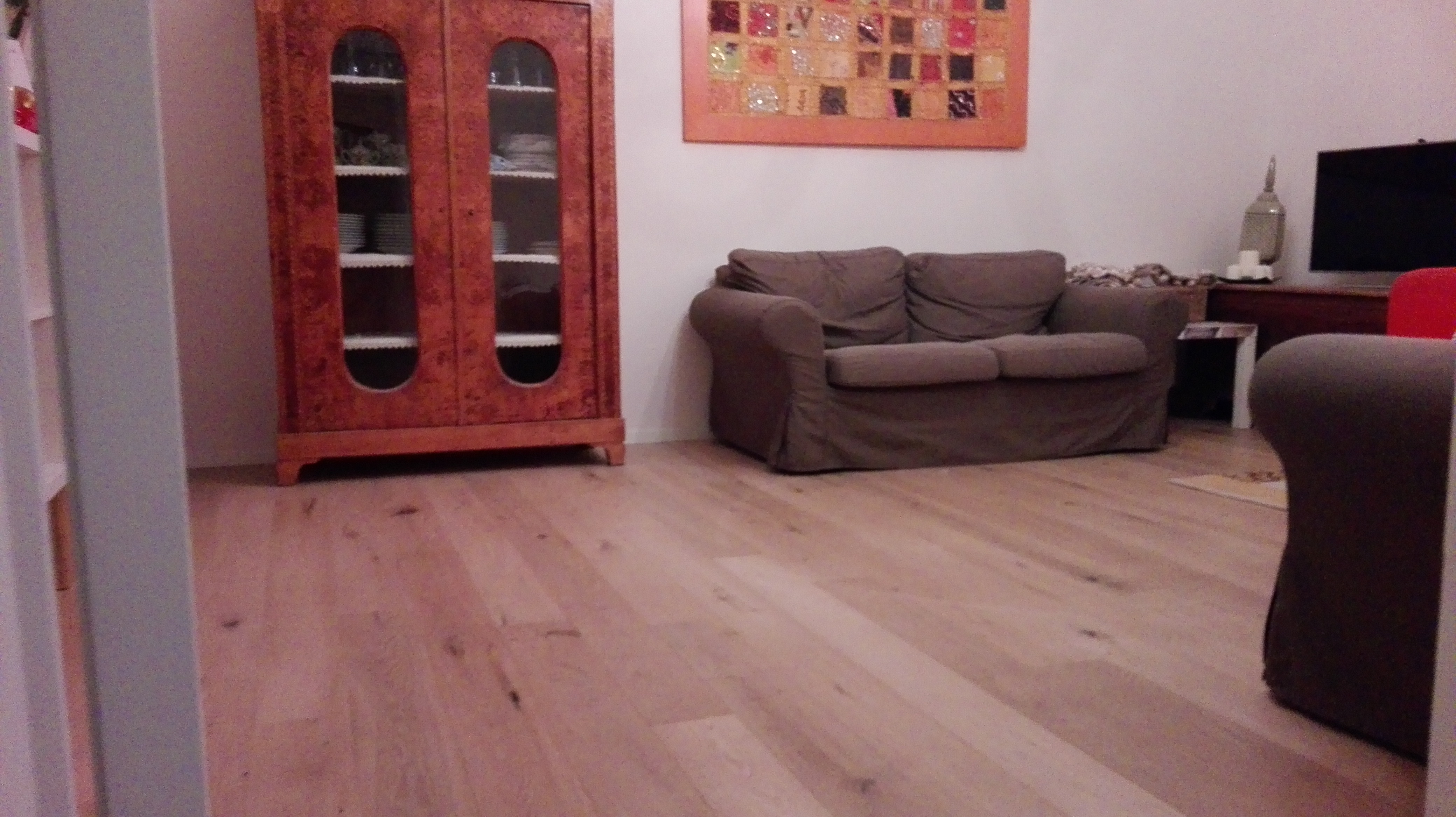 Abbiamo fornito e posato un bellissimo parquet scelto nel nostro negozio, da posare sopra un pavimento in graniglia degli anni ’60. Il materiale scelto è un parquet prefinito nel formato plancia in essenza Rovere scelta rustica, con leggera spazzolatura e finitura ad olio UV per dare l’effetto invisibile, il pavimento è protetto, infatti lo abbiamo messo anche in bagno e cucina, anche se sembra che non ci sia stato fatto nessun trattamento. Abbiamo infine applicato un battiscopa di legno laccato bianco in linea con il colore delle porte.