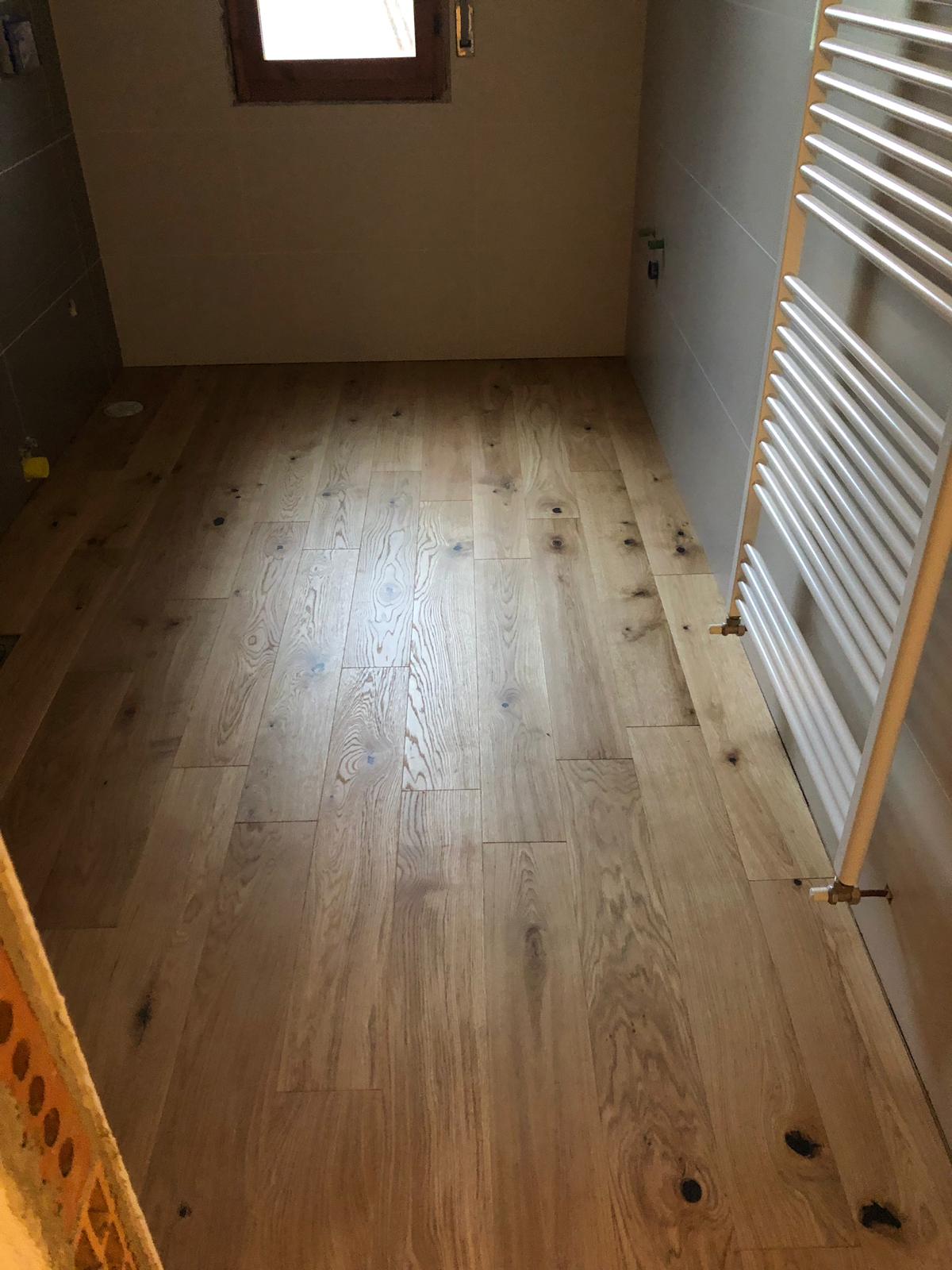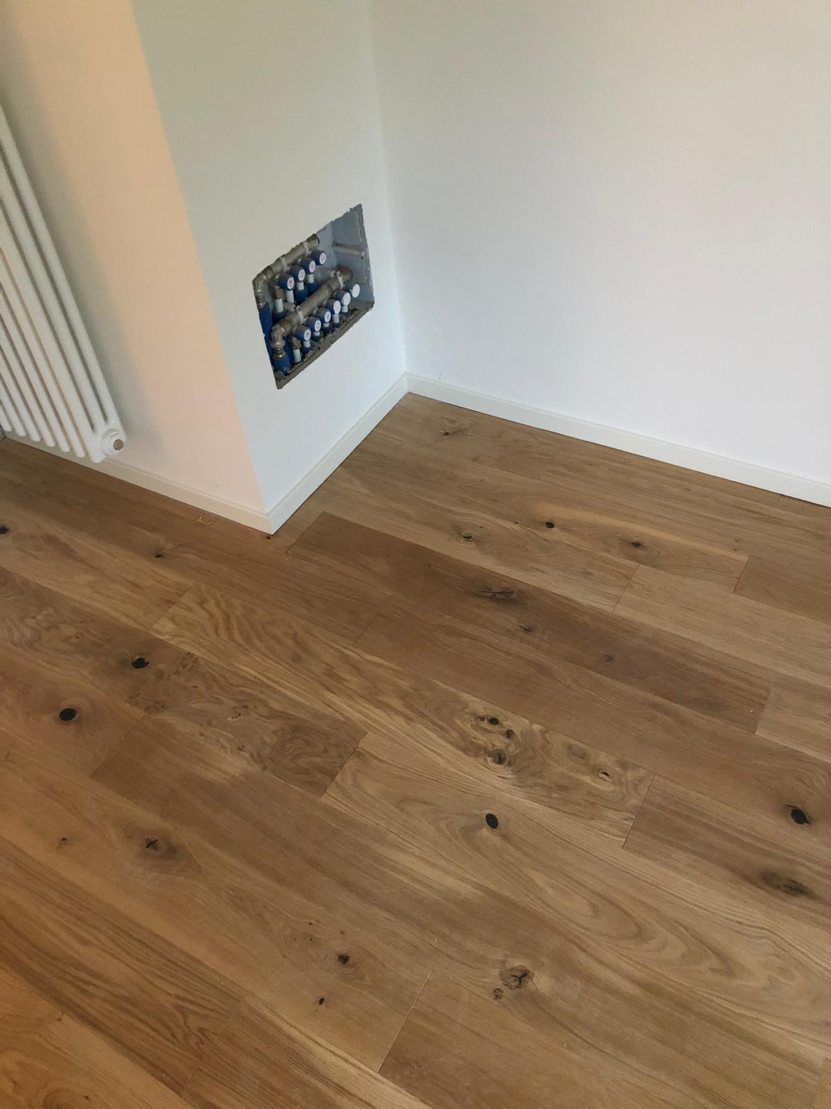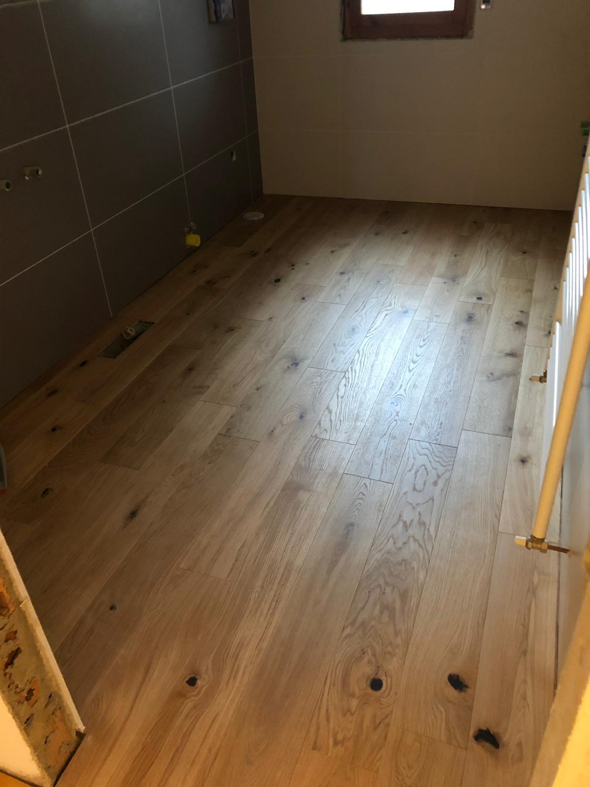 Fornitura e posa in opera di pavimento di legno tipo prefinito a 2 strati in essenza Rovere scelta rustica con nodo grosso, plancia bisellata sui 4 lati. Per posare questo materiale, abbiamo grattato il pavimento esistente così da permettere un miglior ancoraggio del collante. Le foto sono scattate al momento della fine lavori senza arredo, il pavimento dalla forte personalità, figura già benissimo.