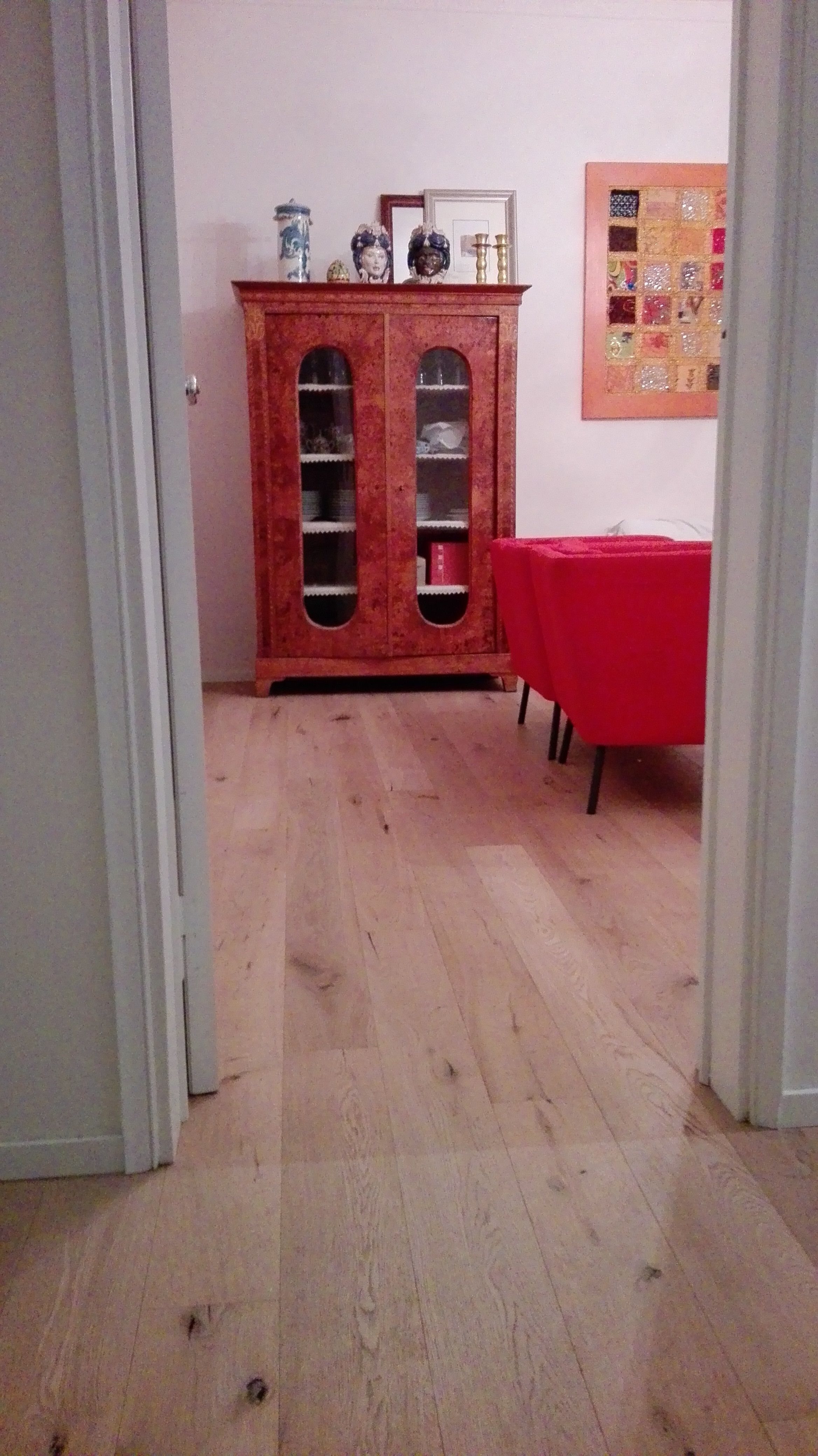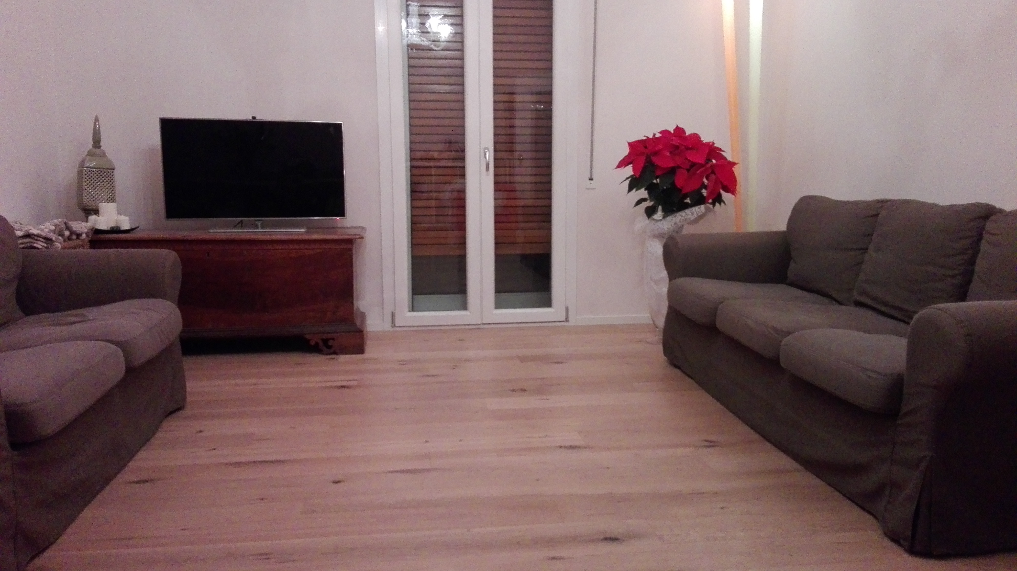 Abbiamo fornito e posato un bellissimo parquet scelto nel nostro negozio, da posare sopra un pavimento in graniglia degli anni ’60. Il materiale scelto è un parquet prefinito nel formato plancia in essenza Rovere scelta rustica, con leggera spazzolatura e finitura ad olio UV per dare l’effetto invisibile, il pavimento è protetto, infatti lo abbiamo messo anche in bagno e cucina, anche se sembra che non ci sia stato fatto nessun trattamento. Abbiamo infine applicato un battiscopa di legno laccato bianco in linea con il colore delle porte.
