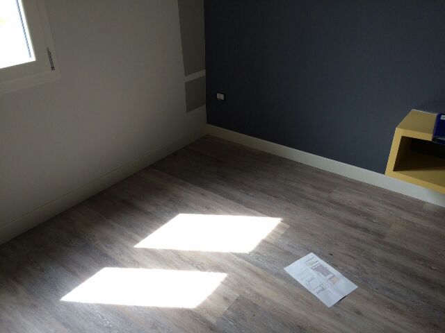 Per evitare di fare tagliole nei pavimenti esistenti, si è pensato di fare una struttura elevata in legno. Abbiamo fornito e posato dei quadri di legno di 10x10 cm, posati ad intervalli di 50 cm, riempito gli spazi vuoto con Leca, poi pannellato con compensato di spessore 10 mm. Abbiamo rivestito il tutto con un pavimento in vinile fotografato legno, di basso spessore ma molto molto resistente, il materiale è lo Starfloor Tarkett, molto elegante e che assorbe perfettamente il rumore del calpestio